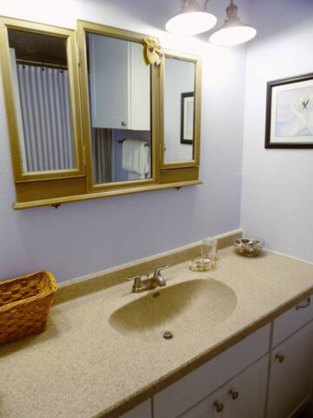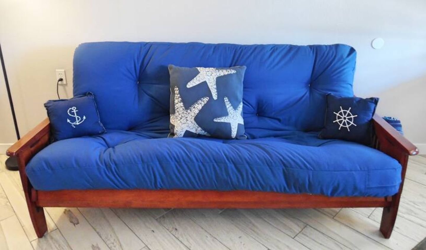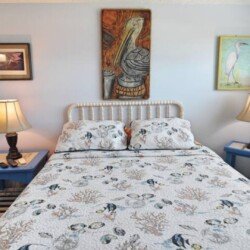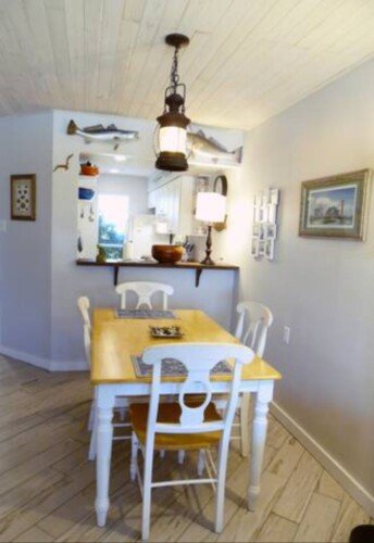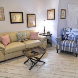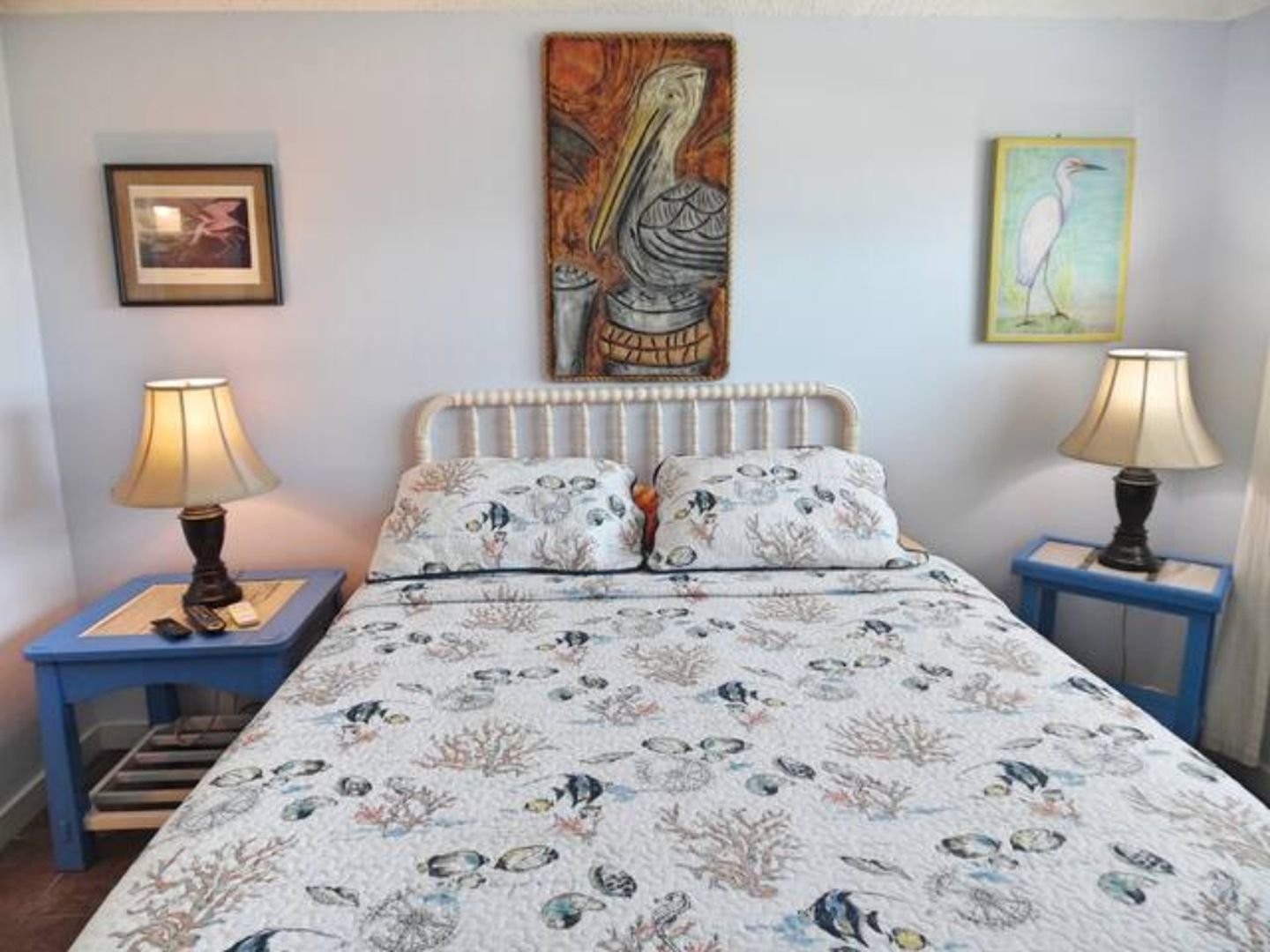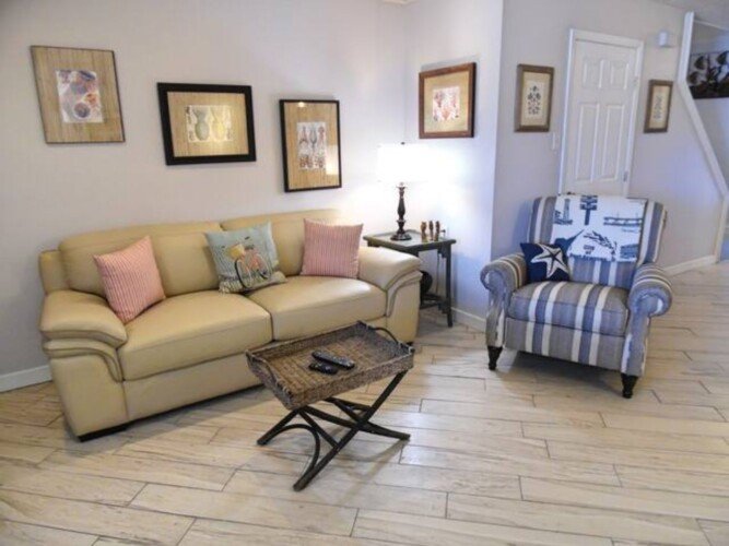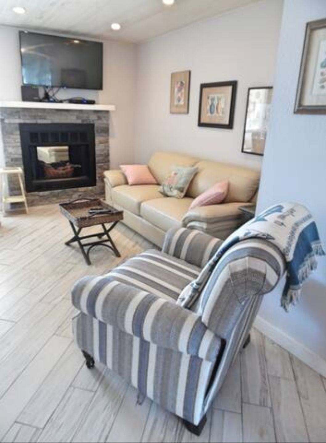 This 2 bedroom/2 bath updated condo has bedrooms upstairs; living area and kitchen downstairs.  Airy, coastal decor.  Each bedroom has a queen bed and private bath. The first floor has a 1/2 bath, a queen sofabed, and a queen futon in the large living room.  Roku streaming tvs in each bedroom and the living room.  Bring your Netflix password (or other fav app) and enjoy the same programming you do at home.  Spectrum cable app included for local programming. Fully equipped kitchen opens up with a breakfast bar to living room.  Full sized washer/dryer.